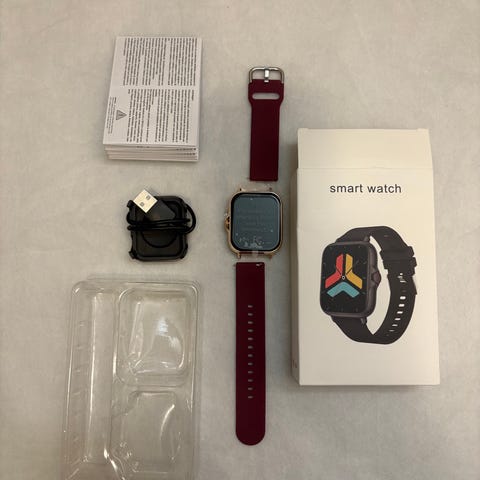 Smartwatch med originalförpackning,två extra armband,laddare samt instruktioner. Batteriet varar i ca.4 veckor.
