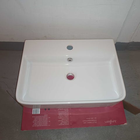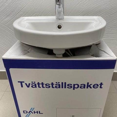 Tvättställ i vitt porslin med en kran monterad. Passar för badrum eller toalett. Helt nytt vattenlås.