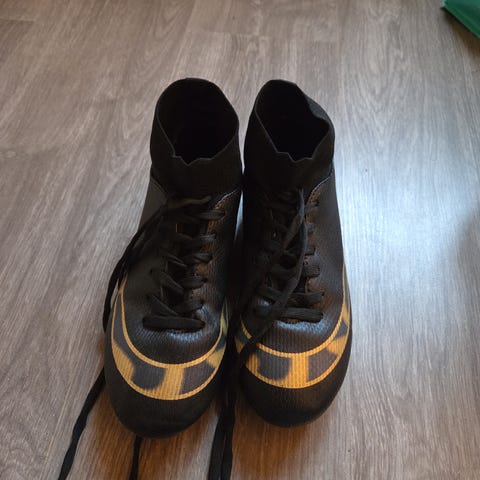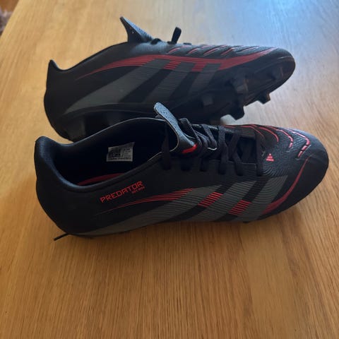 Adidas Predator fotbollsskor i svart och röd färg med snörning. Skorna är designade för fotbollsspel och har en textil- och syntetmaterialkonstruktion.