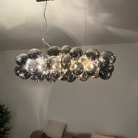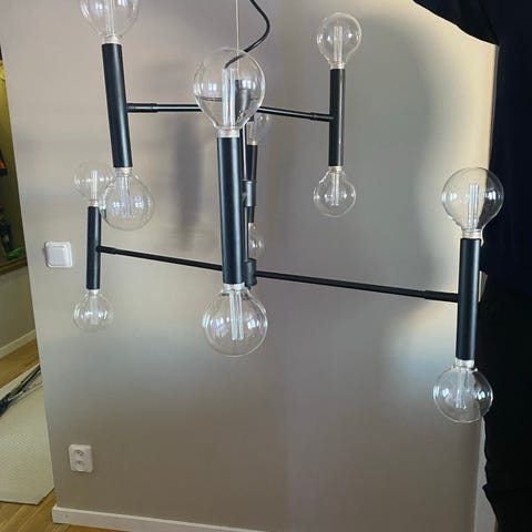 Säljer en Splendor taklampa (By Rydéns) i krom/rökgrå, 58 cm pga flytt. Sparsamt använd och i mycket bra skick. Snygg design med 15 rökfärgade glaskulor som ger ett exklusivt intryck. Perfekt över matsalsbordet eller i vardagsrummet!