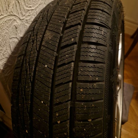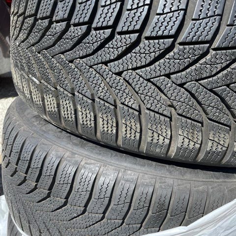 Däcken har bra mönsterdjup. Fälgarna är i begagnat skick med normalt slitage, inga uppenbara sprickor vad jag kan se.