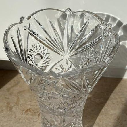 En korgformad / båtformad vas i naturlig kristall.