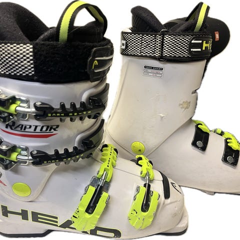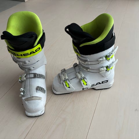 Head Raptor Racing skidpjäxor i svart färg. Skidpjäxorna har fyra spännen för justering och en rem över vristen för extra stöd. Sulan visar viss användning men är i funktionellt skick. Pjäxorna är avsedda för skidåkning och har en robust konstruktion.