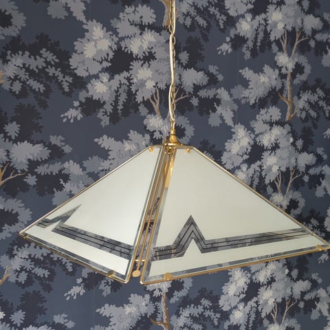 Taklampa i mässing och glas Lampan har en kedja för upphängning.