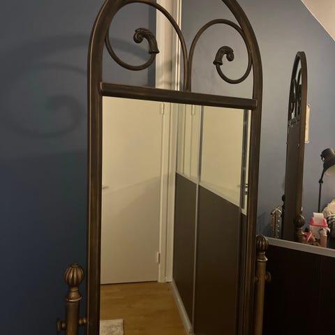 Rund dekorativ spegel med ram i guldfärgat trä 90 cm i diameter.