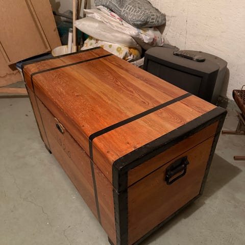 Brudkista / Trälåda tillverkad i trä med en låsbar lucka och gångjärn (nyckel saknas)