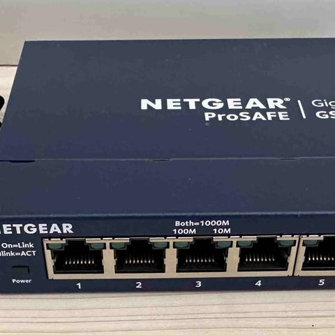 Netgear nätverksswitch med flera portar för anslutning av nätverksenheter. Enheten är utrustad med strömkabel och har en kompakt design lämplig för nätverksinstallationer.
