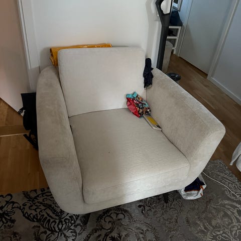 Den vita soffan är tvättad med möbeltvätt men några fläckar finns.