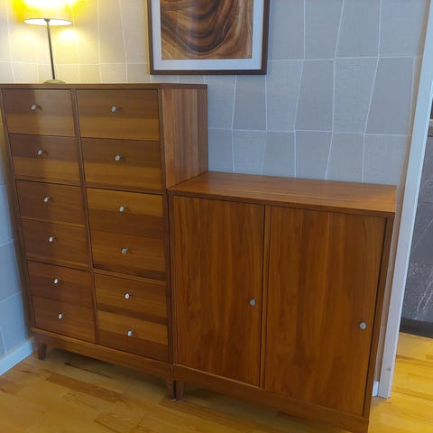 Lackerad massiv/fanerad ek med natur-rotting. Funkar bra till 50-tal, 60-tal och modern inredning. Jag har haft dukar och sånt i denna, så den har använts sparsamt.