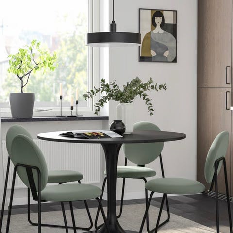 IKEA matbord med stolar i svart färg. Bordet har en rektangulär form. Fyra bekväma stola med avtagbart tyg ingår