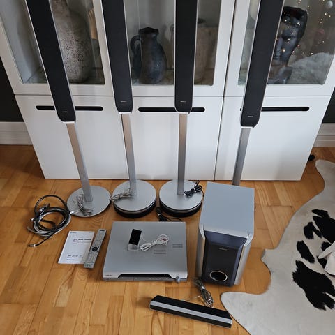 Fin komplett Stereo anläggning som spelar Radio , DVD och CD skivor har HDMI utgång och flera ingångar. Mini anläggning av det bättre snittet med bra ljud och ser snyggt ut. 2.1 ljud med 8" subwoofer och snygga högtalare i aluminium finnish. förstärkare på 2 x70w front och 1 x 140w till subwoofer. nypris ca 15000:-