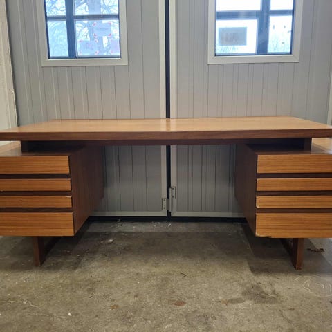 Mycket robust skrivbord i fint skick med hurts samt "tårtbit" som är valbar att använda. Skrivbordet har manuell höjdjustering och har måtten