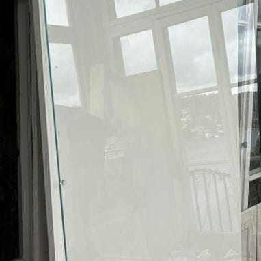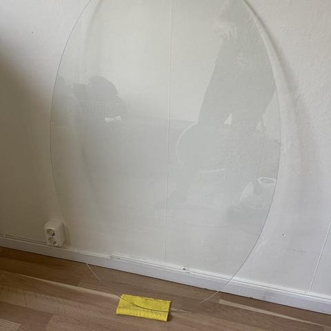 En rund glasskiva som jag använd till fönster inomhus. Den är 80 cm i diameter och 6 mm tjock.