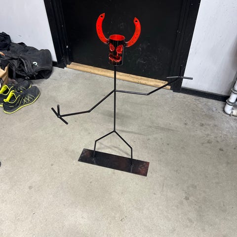 Metallskulptur föreställande ett djurhuvud med horn. Skulpturen är tillverkad i metall och har en rustik design. Passar som dekorationsobjekt i hem eller trädgård. Från MIO, nypris ca 500 kr.
