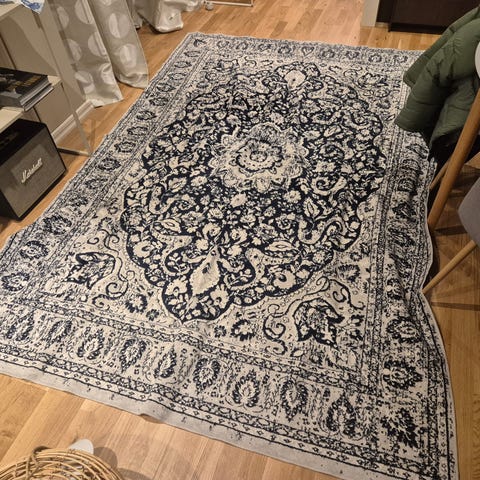 Säljer en ljus matta i neutral färg, passar bra i vardagsrum eller sovrum. Normal användning. Det finns ett mörkare gångstråk i mitten av mattan (se bild), vilket är vanligt vid användning och påverkar inte funktionen.