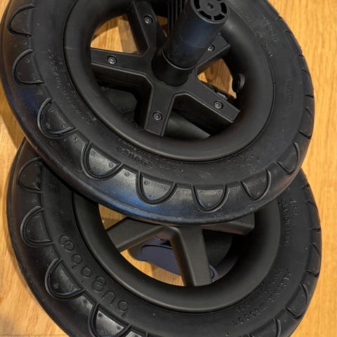 Bugaboo hjul för barnvagn. Svarta hjul med slitstark gummiyta. Passar som reservdel eller för utbyte på kompatibla Bugaboo barnvagnar.
