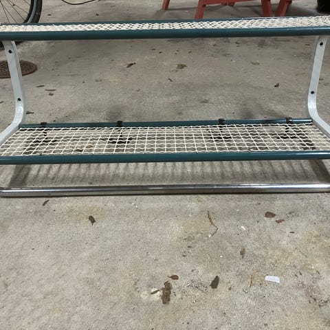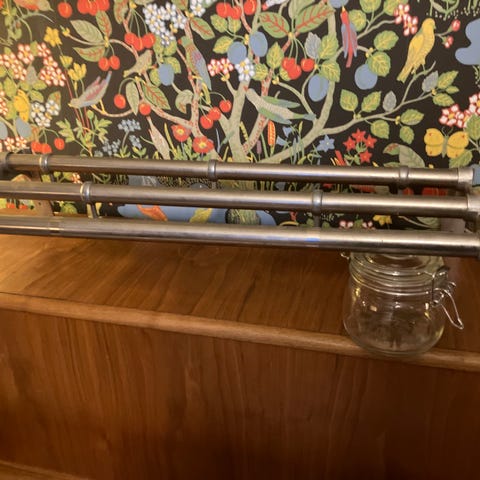 Snygg funkis hatthylla, sannolikt 50-tal. Klassisk funktionell design av Gunnar Bolin i originalutförande. Passar perfekt i hall, tambur eller kontor. Tre Metallsänger med sex ankarkrokar. Lite patina, men bra skick.