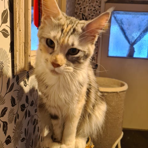 Jag behöver nu sälja min fina katt Kerstin. Kerstin är 1 år gammal och har stamtavla i sverak. Hon är en mycket busig och sprallig tjej som älskar att vara med och delta i vardagliga sysslor. Hon är van med hundar i hemmet. Hon har tyvärr utvecklat kronisk kattsnuva och kan tyvärr inte bo tillsammans med andra katter. Den kroniska kattsnuvan är inget som påverkar hennes mående negativt och det kräver ingen behandling. Kattsnuvan kommer i skov och då blir hon snorig och nyser en del. Detta kommer främst efter att hon har löpt. Kerstin är ej kastrerad än. Vid köp får man med kattleksaker, kattlåda, katthus, matskål samt vattenskål.