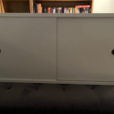 Stringhylla med vita gavlar och hyllplan i ask.