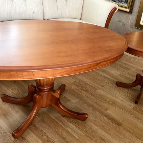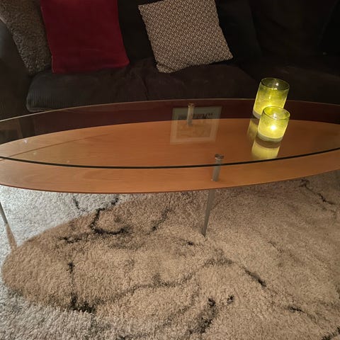 Ovalt soffbord med glasskiva under. Massivt trä oljad ek. Varumärke Sundlings. Nypris 15995:-