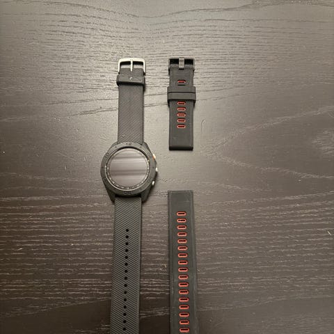 Garmin Approach S62 GPS-klocka i svart färg. Utrustad med avancerade golfrelaterade funktioner och GPS-teknik. Inkluderar laddningskabel och användarmanual. Designad för att användas vid golfspel och andra utomhusaktiviteter.