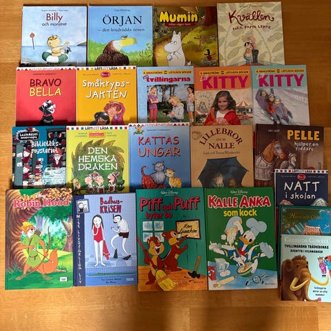 En samling barn- och ungdomsböcker med olika titlar för åldrar från ca. 3 till 12 år. Bland annat Pelle Svanslös, Brunos äventyr, Seawalker och Vargbröder. Från bra skick till oanvända.