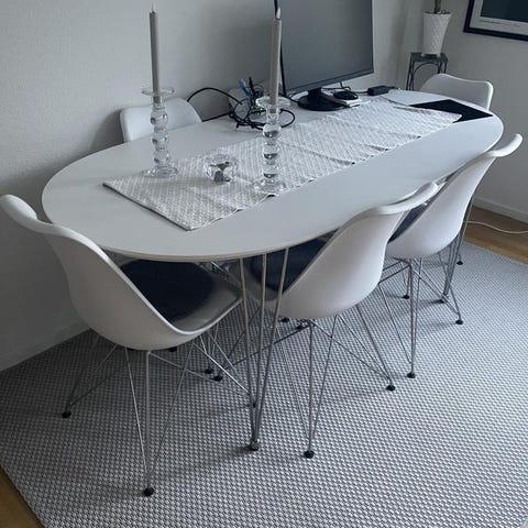 Stilren och högkvalitativ matgrupp bestående av ett bord med tillhörande fyra stolar. Bordet och stolarna är tillverkade i massiv ek (slipbart) med en naturlig träfinish. Stolarnas sitsar är klädda i slitstarkt veganläder. Matgruppen är