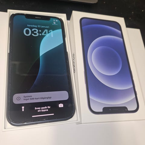 Iphone 12 med 64 GB minne i mörkblå färg.