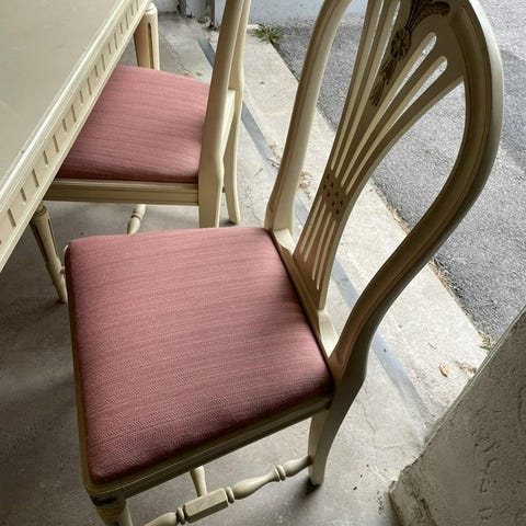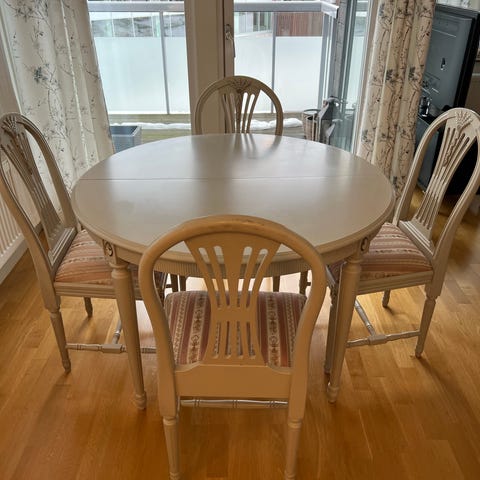 4 st stabila stolar och runt bord med iläggsskiva. Stolarnas sitsar är klädda med tyg som behöver bytas.