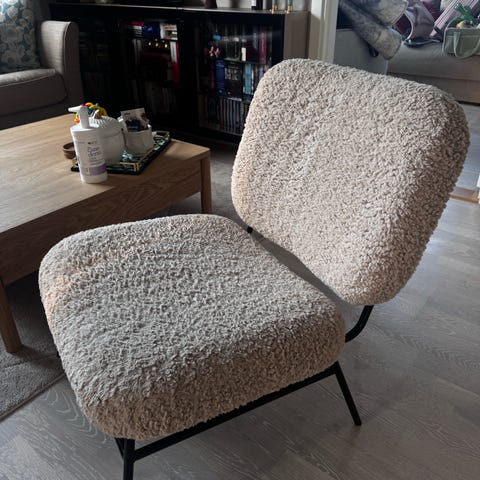 Jysk Vildsund fåtölj i offwhite färg med teddy-tyg och naturfärgade ben. Fåtöljen har en mjuk och textured yta som ger komfort och stil till rummet.