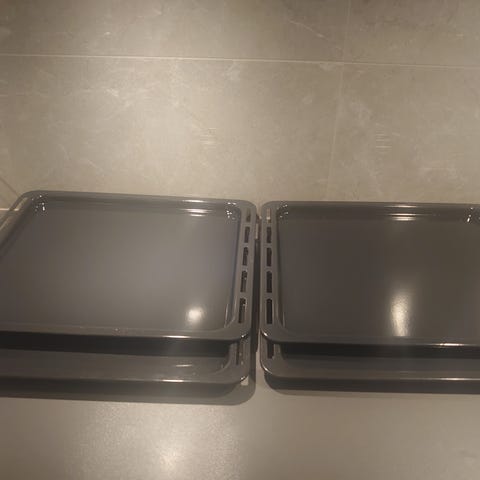 3 ugnsplåtar i metall, avsedda för bakning och matlagning i ugn. Plåtarna är rektangulära och har kanter för att hålla maten på plats. 1 är med högre kant . De är lämpliga för allmän användning i köket. Mått :46*37.5 cm. Finns i hille