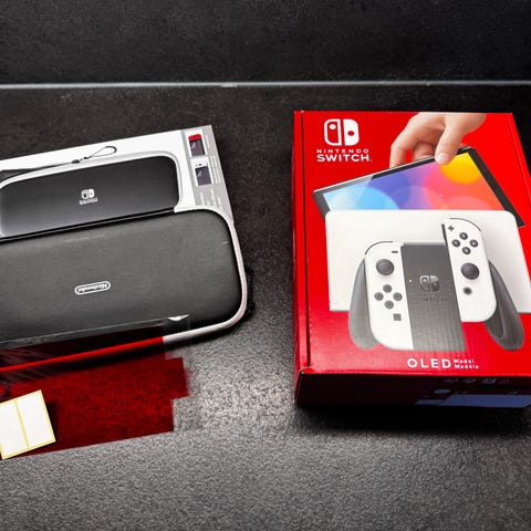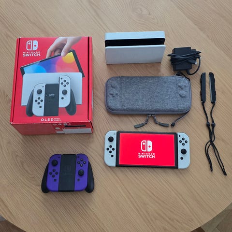 Nintendo Switch konsol med vit färg. Konsolen är bärbar och har avtagbara Joy-Con-kontroller i vitt. Passar för spel på språng eller ansluten till TV via dockningsstation.