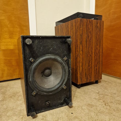 Högtalare i original från 1970,elementen är hela och mäter 5 ohm,ett fanerskada på ovansida kant på en högtalare.