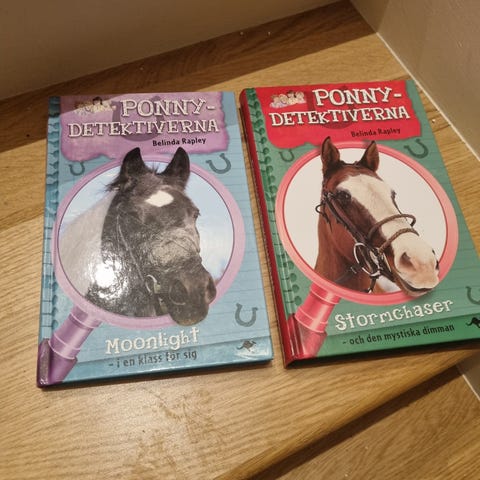 Sju hästböcker för barn och ungdomar. Inkluderar titlar som 'Hästdetektiverna - Mysteriet med den blodröda ponnyn', 'Hästen från himlen', 'Led sadlar om', 'Ett hem för Merlin', 'Paula på ponnygården', 'Tarzan och jag' och en bok från B. Wahlströms ungdomsböcker serie. Se bild.