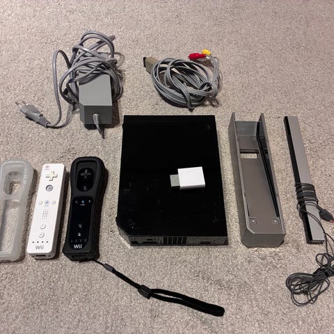 Nintendo Wii spelkonsol i vit färg. Inkluderar konsol, strömkabel och anslutningskablar samt sensor.