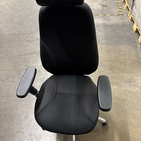 Kontorsstol med justerbara armstöd och hjul. Klädd i grått tyg och har en hög rygg för stöd. Passar för kontorsmiljöer och arbetsplatser där rörlighet och komfort behövs.