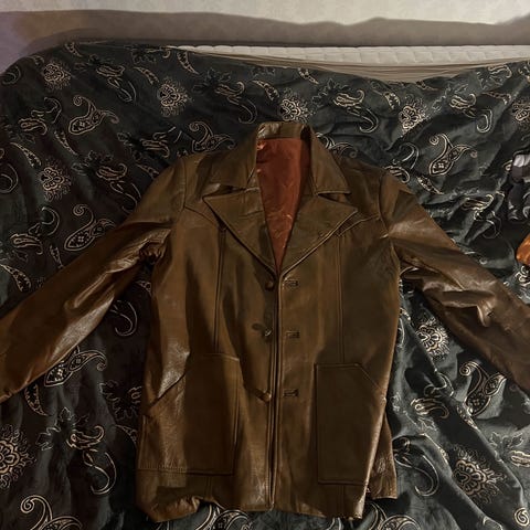 Wacko läderjacka i brun färg, storlek XL för herr. Tillverkad i lädermaterial och avsedd som ytterplagg.