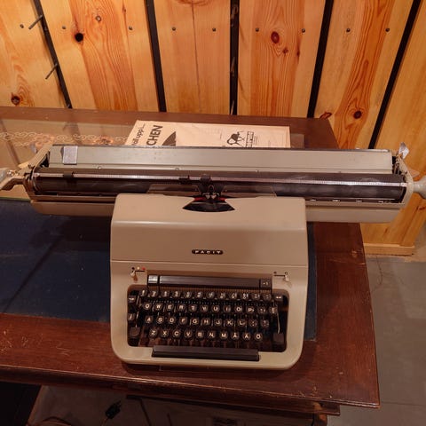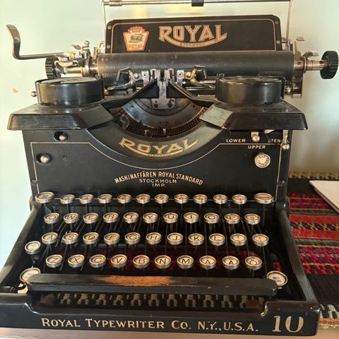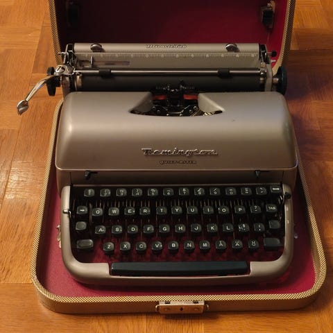 Remington Holiday skrivmaskin i blå färg med vit och svart tangentbord. Modellen är kompakt och levereras med ett bärbart fodral i grått. Skrivmaskinen är mekanisk och har tangenter med svenska tecken (å, ä, ö).
