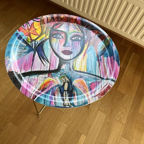 Metallben i guld färg och ovansidan i färgglada slice of life motivet.