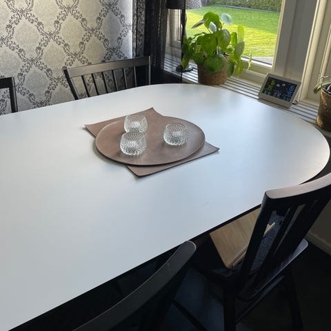Söker någorlunda klassisk matsalsgrupp i ljus (men inte vit) färg. Angivna mått är ungefärliga.
