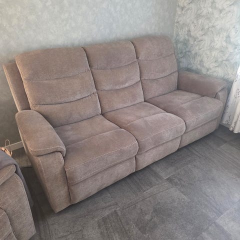 Mio soffa med reclinerfunktion i grått tyg. Soffan har två reclinerstolar med fotstöd och en mittsektion med förvaringsutrymme och kopphållare. Passar för vardagsrum och ger möjlighet till avslappning med justerbara sittlägen. Väldigt bra skick. Inga fläckar o inget slitage. Finns i Odenslanda. Nypris 21 995 kr. Nu 10 000 kr prutat o klart.