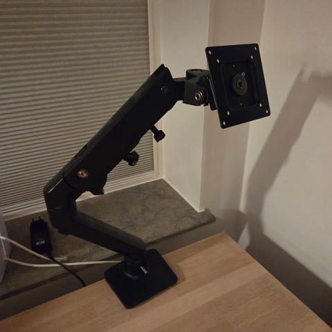 Ergotron trace monitor arm: https://www.ergotron.com/trace