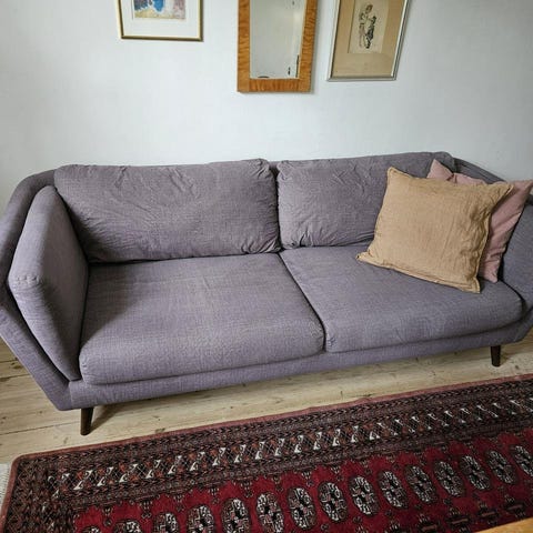 3-3,5-sitssoffa med höga smala armstöd och snygga ben i svart stål. Tyget heter muskot och är i en brungrå nyans Pris inkl. 2st decokuddar i samma tyg som soffan. Nypris 12990kr.