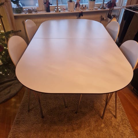 Mio matbord i vitt med tillhörande stolar. Stolsitsarna är klädda i svart tyg. Möbelsetet är anpassat för matrum och har en enkel och funktionell design. Bordet är utfällbart.