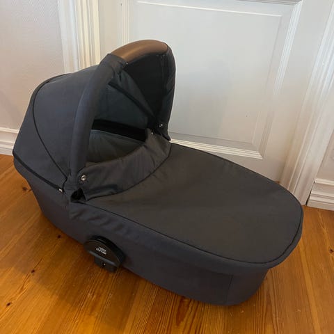 Britax chassie i svart färg. Chassiet har ett handtag med brunt läderliknande material och fyra hjul. Den är utrustad med en rymlig förvaringskorg under sittdelen.