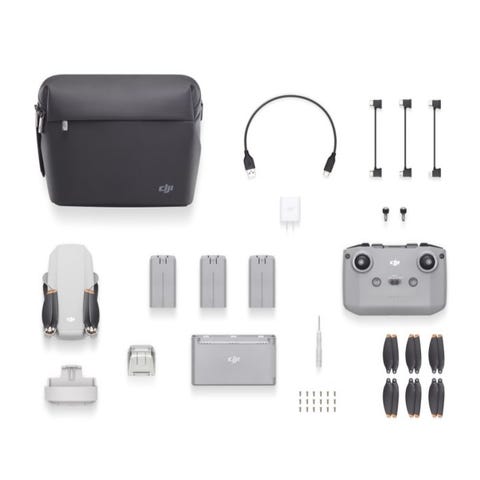 DJI Mini 3 Pro dronset inklusive fjärrkontroll, propellerskydd, extra batterier och annan nödvändig utrustning för drönarflygning. Setet innehåller flera propellrar, batteriladdare och kablar för anslutning.