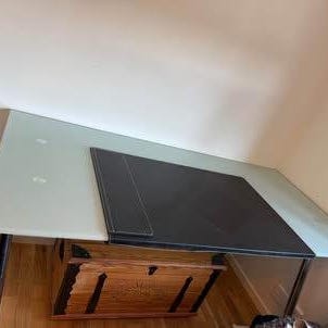 Skrivbord från IKEA, Linnmon-skiva med Adils-ben. Bra skick dock är uttag gjort för sladdar så den kan stå mot väggen, vilket inte är så kosmetiskt.