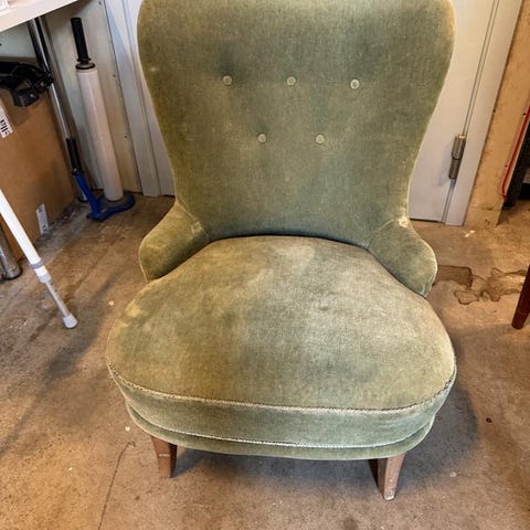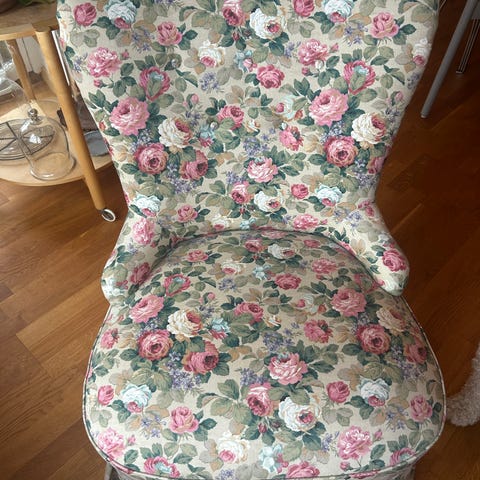 Klassisk Emma-fåtölj med klädsel i rosa och vitt. Omklädd hos en professionell möbeltapetserare och i absolut nyskick.