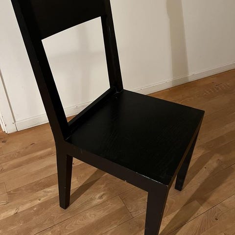 Stolarna är klädda i mörkt tyg med svarta metallben. Bekväma, stabila och tidlösa – passar perfekt runt matbordet.