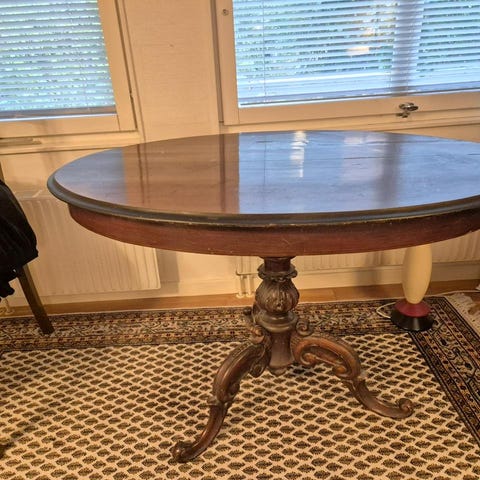 Mkt fint skick för sin ålder. Höjd ca 75 och omkrets ca 84. Mahogny med vackra gulddetaljer och lejonfötter. Perfekt matbord 2-4 pers.